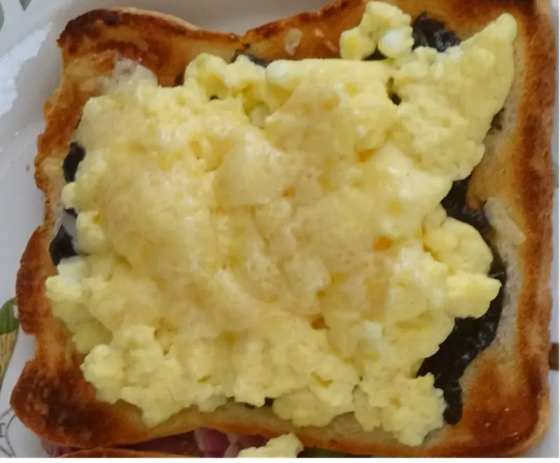 Combine all ingredients and cook on med-high in a well buttered non-stick pan for about 5 – 7 minutes or until cooked. Stir 2 or 3 times while cooking, Serve on toasted bread.- Enjoy!